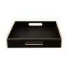 Elevate your serving experience with the Premium Leatherette Black Square Serving Tray, expertly crafted from high-quality faux leather and sturdy MDF, accented by a refined gold lining. Its sleek square design adds a touch of modern sophistication to any gathering—perfect for presenting appetizers, beverages, or desserts. Available in two sizes or as a convenient twin set, this tray combines style and function in one elegant piece. Water-resistant and easy to clean, simply wipe with a dry or damp cloth to maintain its polished look. As a handcrafted item, slight variations in finish are natural and add to its unique charm.