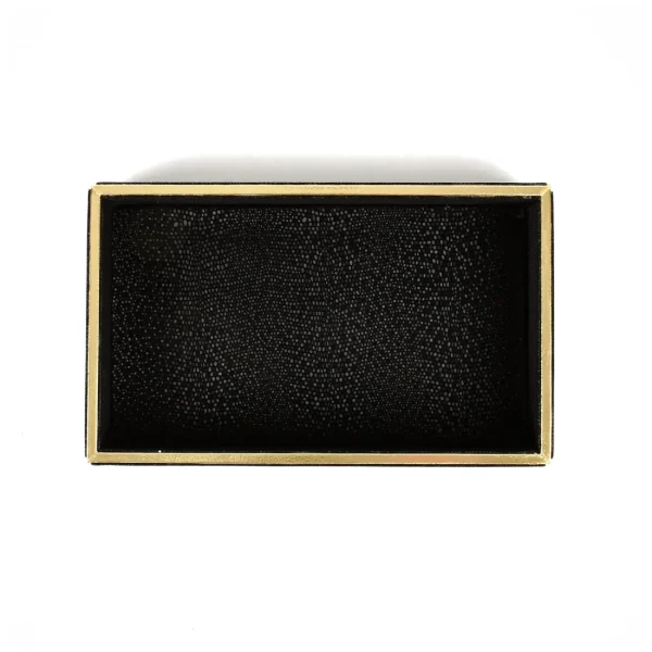 Redefine elegance in your bath or vanity space with this Premium Leatherette Black Towel/Vanity Tray. Crafted from high-quality faux leather and durable MDF, it showcases a bold black finish enhanced with luxurious gold lining for a sleek and sophisticated appeal.