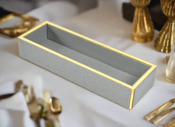 Add a touch of elegance to your dining setup with this Premium Leatherette Grey Long Cutlery Tray. Crafted from high-quality faux leather and sturdy MDF, it features a sleek grey finish with a refined gold lining for a luxurious appeal.